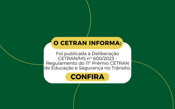 Confira o Edital publicado pela Deliberação 600/2023 do 11° Prêmio CETRAN de Educação e Segurança no Trânsito, que tem como tema “No Trânsito, Escolha a Vida”. O objetivo é motivar discussões e produções de trabalhos, elaboração e a aplicação de projetos, programas, atividades e produções que promovam um trânsito mais seguro no Estado de Mato Grosso do Sul.