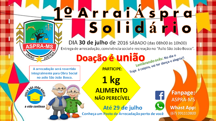 Antecedendo ao Arraiá, a ASPRA, por intermédio de seus associados e familiares está desenvolvendo campanha de arrecadação de alimentos não perecíveis, que poderão ser entregues, até dia 29 de julho, na Secretária de Segurança Pública – SEJUSP e nas Unidades da Polícia Militar de Campo Grande/MS: Batalhão de Trânsito– BPTRAN; BPChoque, Batalhão de Guarda e Escolta; e Comandado – Geral.