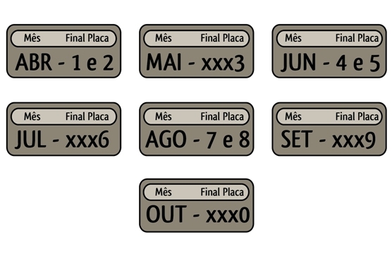 Em Mato Grosso do Sul, o calendário irá vigorar da seguinte forma: placa final 1 e 2, vencimento em abril; placa final 3, mês de maio; placa final 4 e 5, mês de junho; placa final 6, mês de julho; placa final 7 e 8, mês de agosto; placa final 9, mês de setembro e placa final 0 (zero), mês de outubro.