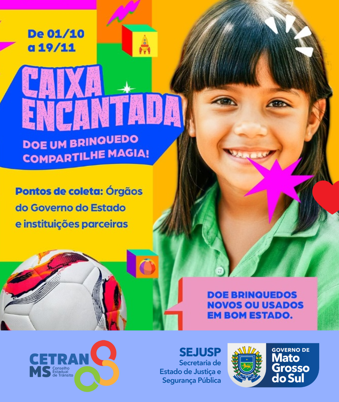 O Conselho Estadual de Trânsito de Mato Grosso do Sul – CETRAN/MS aderiu à campanha solidária “Caixa Encantada – Doe um Brinquedo. Compartilhe Magia!”, iniciativa organizada pela Secretaria de Estado de Administração (SAD), com o apoio da primeira-dama Mônica Riedel. A ação, que completa 10 anos em 2025, mobiliza servidores públicos e a sociedade sul-mato-grossense na arrecadação de brinquedos destinados a crianças em situação de vulnerabilidade social.
