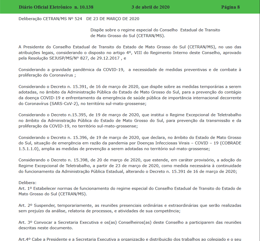 • Deliberação nº 524 – Regime especial CETRAN-COVID19