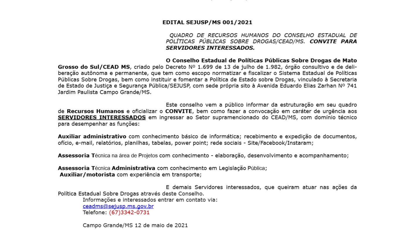 O Conselho Estadual de Políticas Públicas Sobre Drogas/CEAD MS esta em processo de estruturação de seu QUADRO DE RECURSOS HUMANOS e convida os servidores interessados em compor a equipe de trabalho deste colegiado, como informa o documento supramencionado.