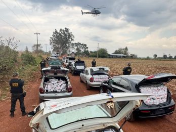 Policiais militares do Departamento de Operações de Fronteira (DOF) e da Coordenadoria-Geral de Policiamento Aéreo (CGPA) apreenderam, na segunda-feira (6), 17 veículos carregados com produtos de contrabando e descaminho no Assentamento Itamarati, em